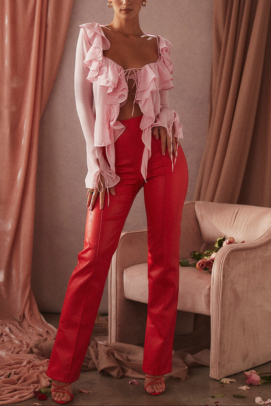 This playful and flirtatious top is crafted from sheer pink fabric, featuring a dramatic, ruffled trim that frames the sweetheart neckline and cascades down the front. The silhouette is defined by a tie-front closure just below the bust and long, flowing bell sleeves with delicate tie detailing at the cuffs. It’s a beautifully romantic piece designed to pair perfectly with high-waisted bottoms for a chic, statement-making look.