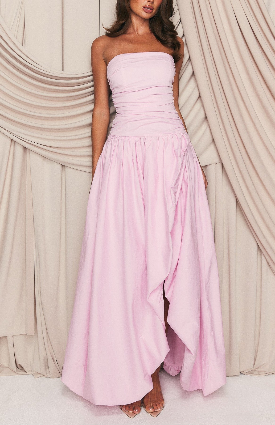 This elegant pink strapless piece features a secure neckline with grip-tape support for a comfortable, stay-in-place fit. Ruching along the bodice creates a flattering gathered effect, complemented by an invisible side zipper with hook-and-eye closure for a smooth finish. The high side slit adds a touch of allure, while the flowing skirt with a bubble hem moves beautifully with every step. Perfect for special occasions, style it with heels and gold jewellery for a graceful, polished look.