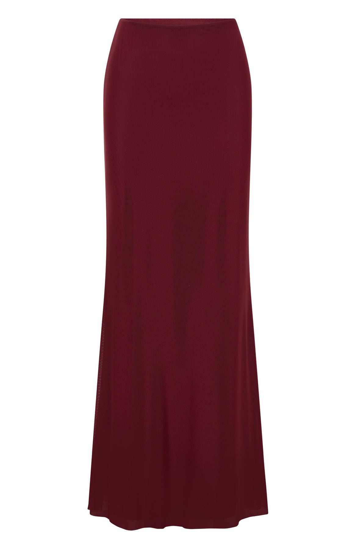 This captivating three-piece ensemble is crafted from a fluid, stretch fabric in a rich deep maroon hue. The strapless top is structured with a flattering, corset-inspired bodice featuring a ruched overlay. The maxi skirt features a body-skimming silhouette that pools elegantly at the floor, perfectly aligning with the top for an elevated, connected look. Complete with a matching scarf, this set is the ultimate statement piece for gala events, black-tie dinners, or a highly sophisticated destination wedding look. Crafted in Quadstretch poly and poly mesh fabric.